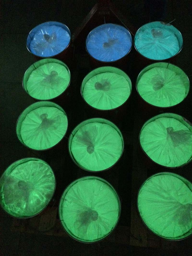 荧光颜料的其他特点简单易行: 荧光粉以氧化铝为基础,氧化铝与活化剂(稀土金属)结合独特 通用-可与任何清漆(水基、丙烯酸、聚氨酯等)结合使用 不恨水-不与水反应(对人体安全,不释放有毒氧化锶) 均匀-确保着色表面均匀发光,而不是点。 荧光粉的特性简单易行: 它由纯度高的最纯净的成分(特别是纯物质)制成。 独特的生产技术使荧光颜料在亮度和发光持续时间(特别是安全性)方面处于领先地位。 在何处以及如何使用: 但它可以与液体透明染料结合使用 磷光体从任何光源(太阳、紫外线、普通灯泡、日间照明、手电筒等)充电。然后,磷光体在黑暗中自动发光(不需要紫外线灯,光线完全自动发光)。